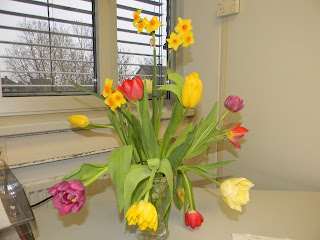 During the past 2 weeks we have enjoyed a glorious transformation here from the cold and grey to sunny days and blossoms and green everywhere. We have a 3 sq. mile old cemetary across the street where we go for our daily walk and it is now so green with trees in bloom and freshly planted flowers. Fresh cuts flowers are also plentiful, especially the tulips. The Frankfurt temple grounds are also so lovely now.